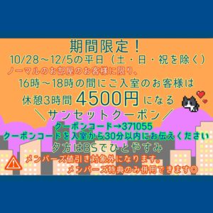 通常5200円の休憩がサンセットクーポン☀️4500円!