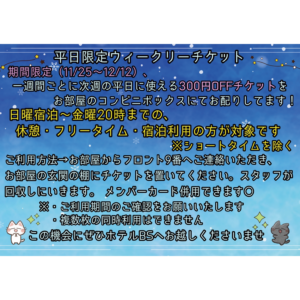 一週間ごとに、次週の平日に使える300円OFFチケットをお部屋のコンビニボックスにてお配りしています!