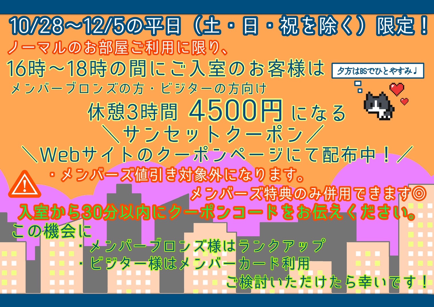 16時〜18時のご入室で休憩3時間がお得にご利用いただけます!