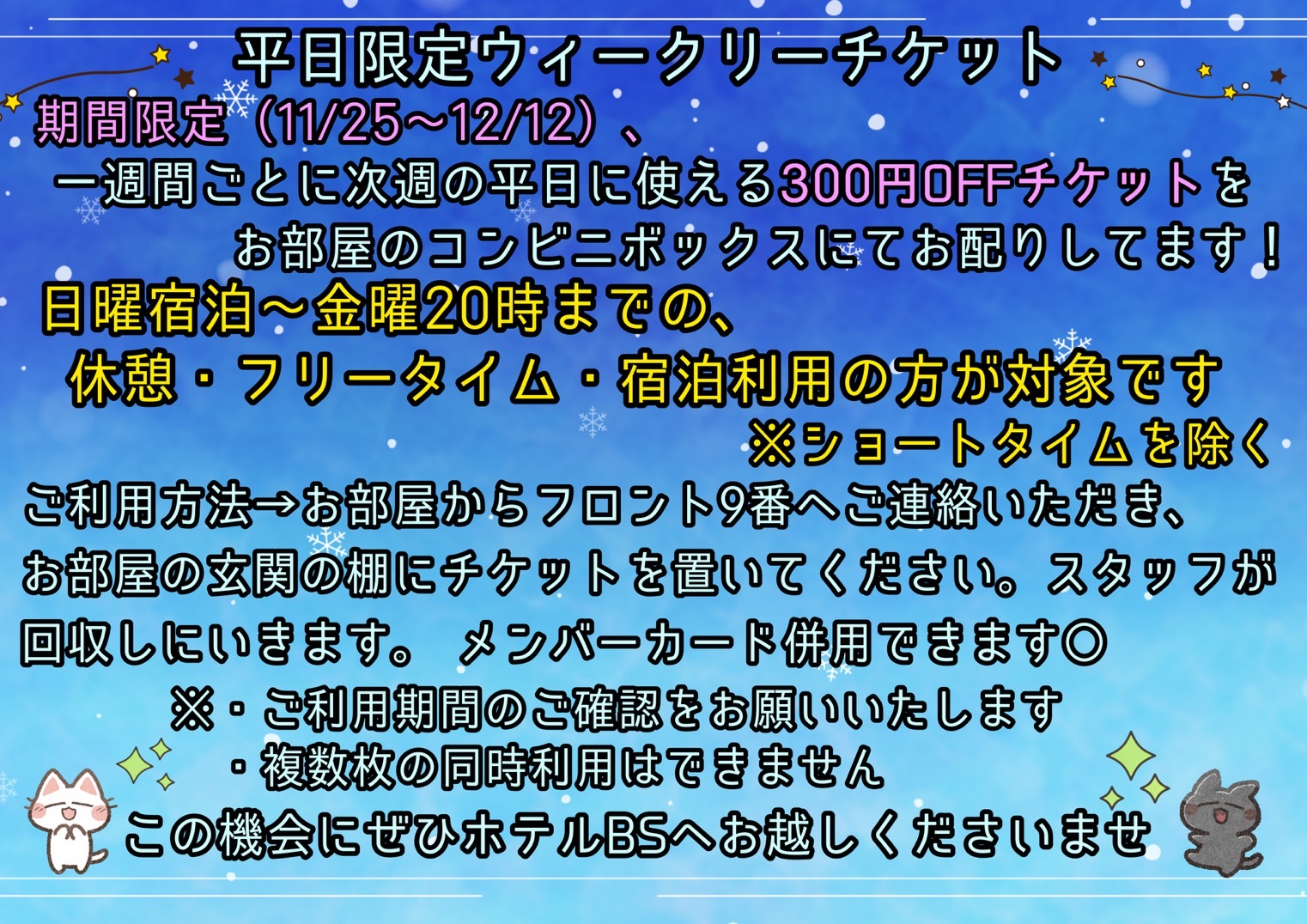 対象:日曜宿泊〜金曜20時までに、休憩・フリータイム・宿泊をご利用のお客様✨
